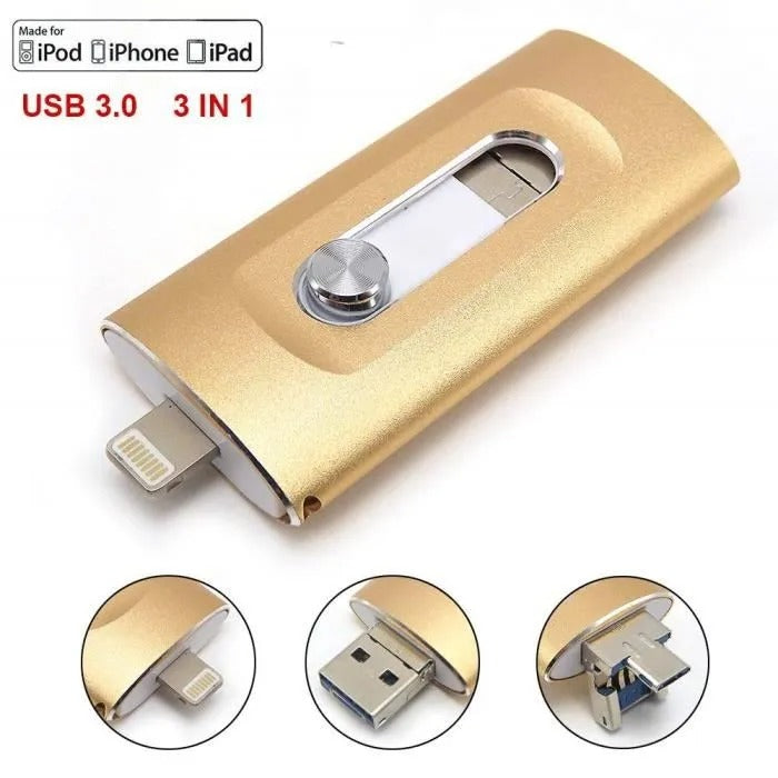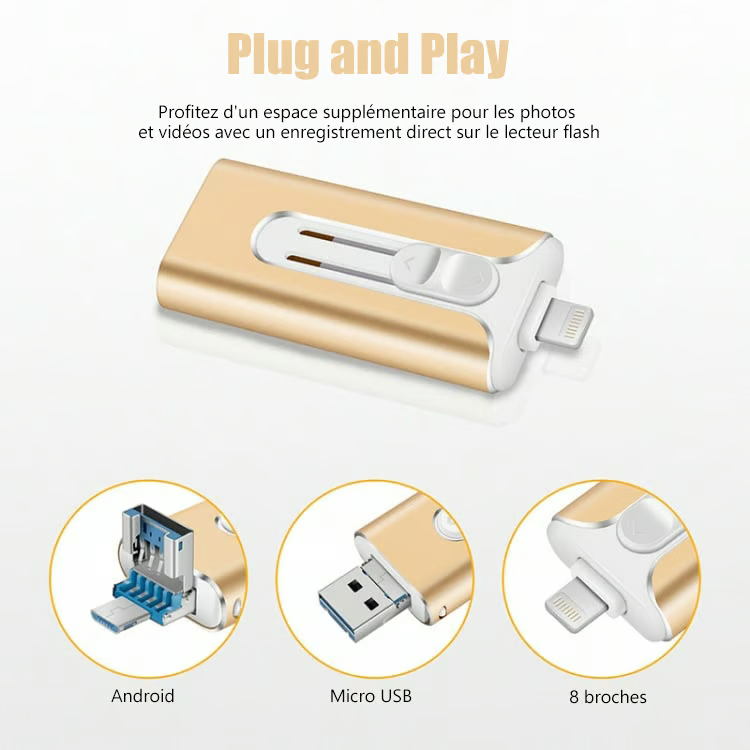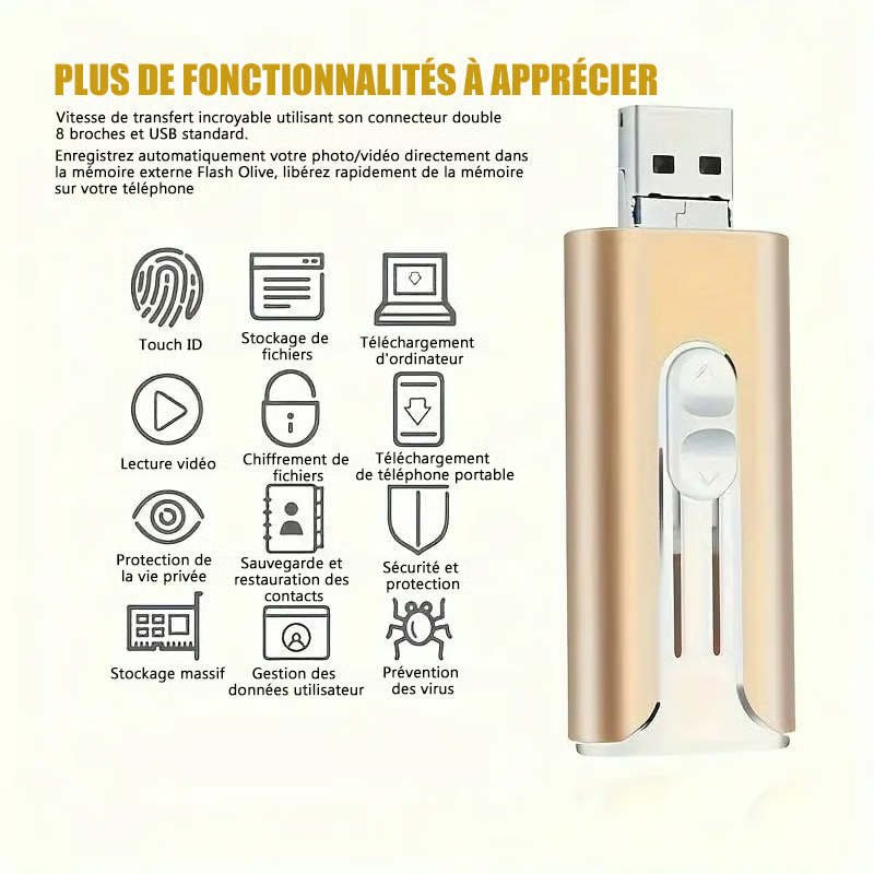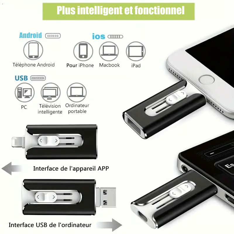 Avec sa grande capacité et sa vitesse de transmission optimisée, cette clé USB externe compatible avec iPad, iPod, Android et ordinateurs vous permet de stocker photos, vidéos, documents et applications sans ralentir votre téléphone. Finis les messages “espace insuffisant” : gardez vos souvenirs à portée de main, en toute sérénité.